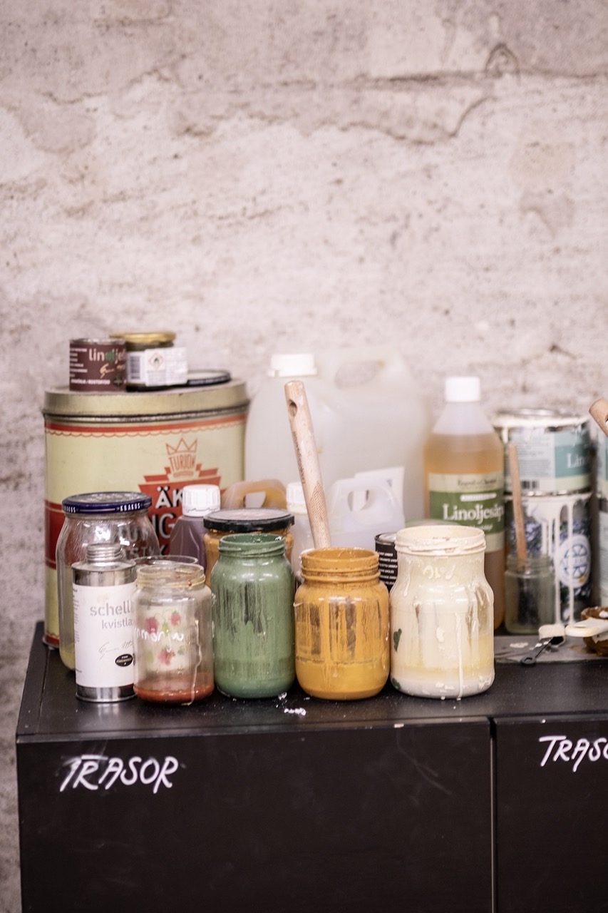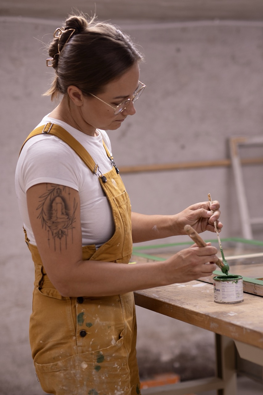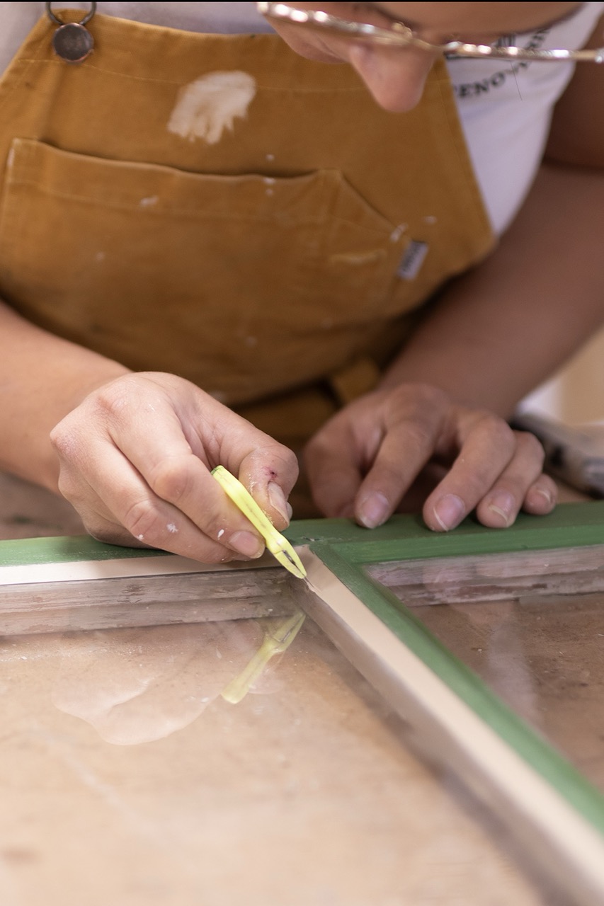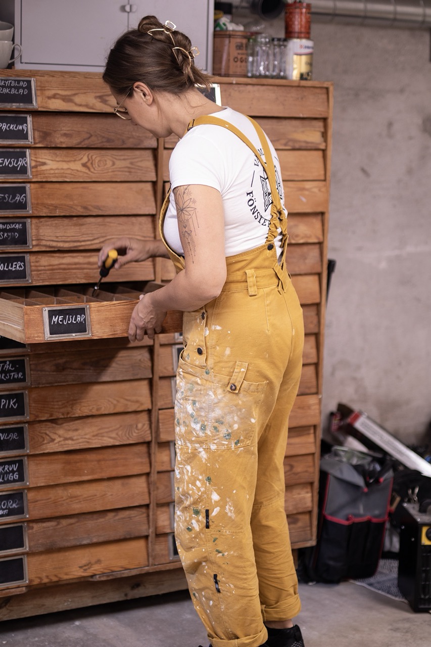 I verkstaden doftar det linolja. Här hänger bågar på tork, några ligger på borden för kittning och målning, medan andra väntar på att lagas med nytt trä. Det är ett hantverk som kräver tålamod, känsla och respekt för de gamla materialen och det är just det som Elin brinner för. Elin berättar att återbruk är en stor del av hennes arbete. “Ser jag gamla bågar med munblåst glas på Blocket så kollar jag alltid om rutorna går att rädda. Är de inte för repiga tar jag hem dem, rengör och använder igen. Samma sak med gamla beslag, de är ofta så fina och går utmärkt att återanvända.”