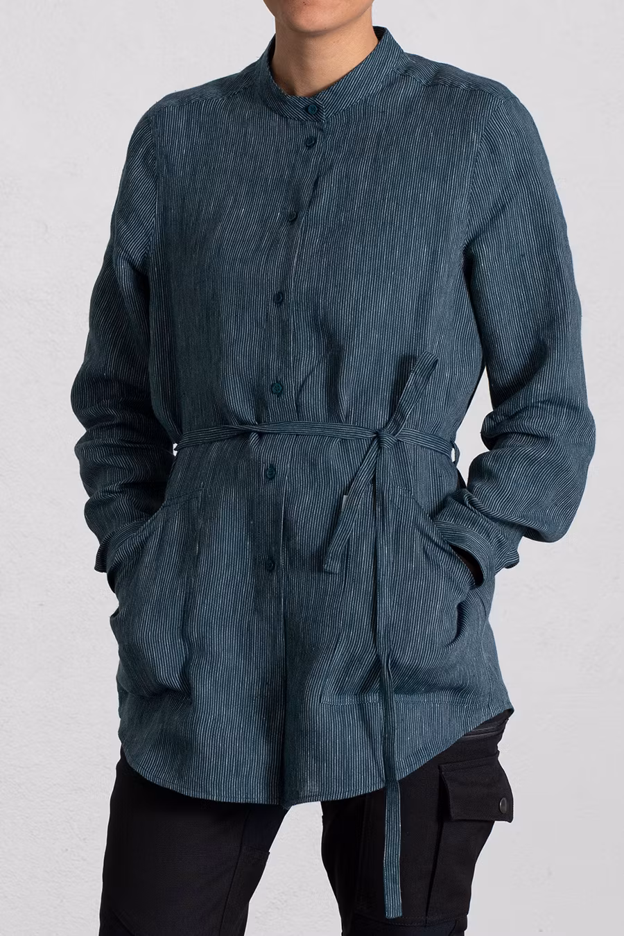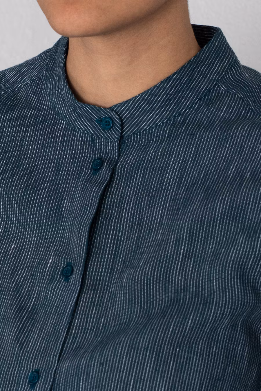 Skjortan: En smårandig linneskjorta med ståkrage och lös passform!