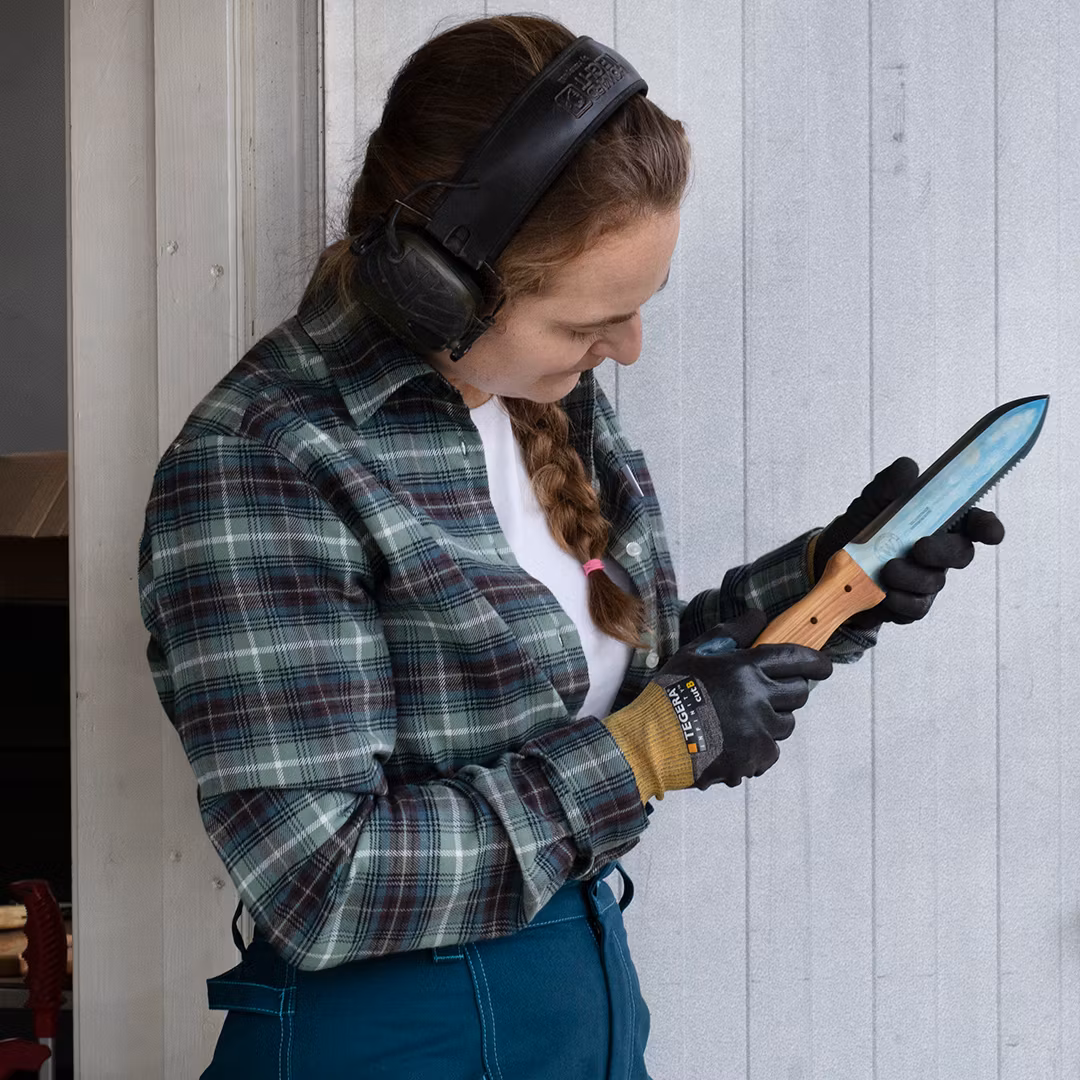Anja som fått ge namn åt vår linneskjorta, är hantverkaren bakom kniven från Mojave Grönt. Hon har också ofta ställt upp som modell åt oss, både när hon jobbat som trädgårdsmästare och när hon tillverkar sina fantastiska knivar. Vi har samarbetat med Anja i många år nu och vi är så glada över att vi får sälja hennes Hori Horis!